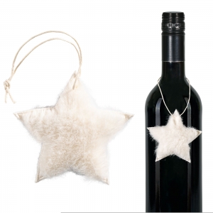 Dieser flauschige, weiße Stern kann prima an Geschenke und Flaschen gehängt werden.