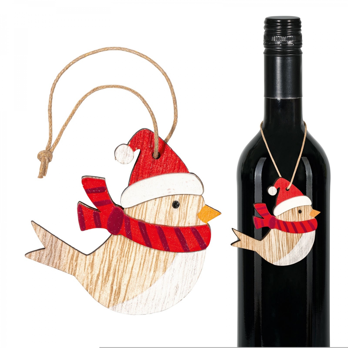 Die Anhänger aus Holz zeigen ein Vögelchen mit Mütze und Schal.