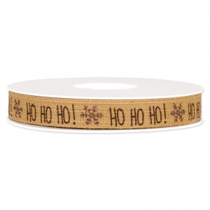 Das Baumwollband ist Naturfarben und mit dem Schriftzug "Ho Ho Ho" und kleinen Schneeflocken bedruckt.