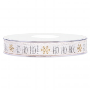 Das Baumwollband ist weiß und mit dem Schriftzug "Ho Ho Ho" und kleinen Schneeflocken bedruckt.