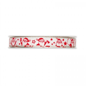 Weißes Geschenkband mit roten Weihnachtsmännern bedruckt.