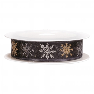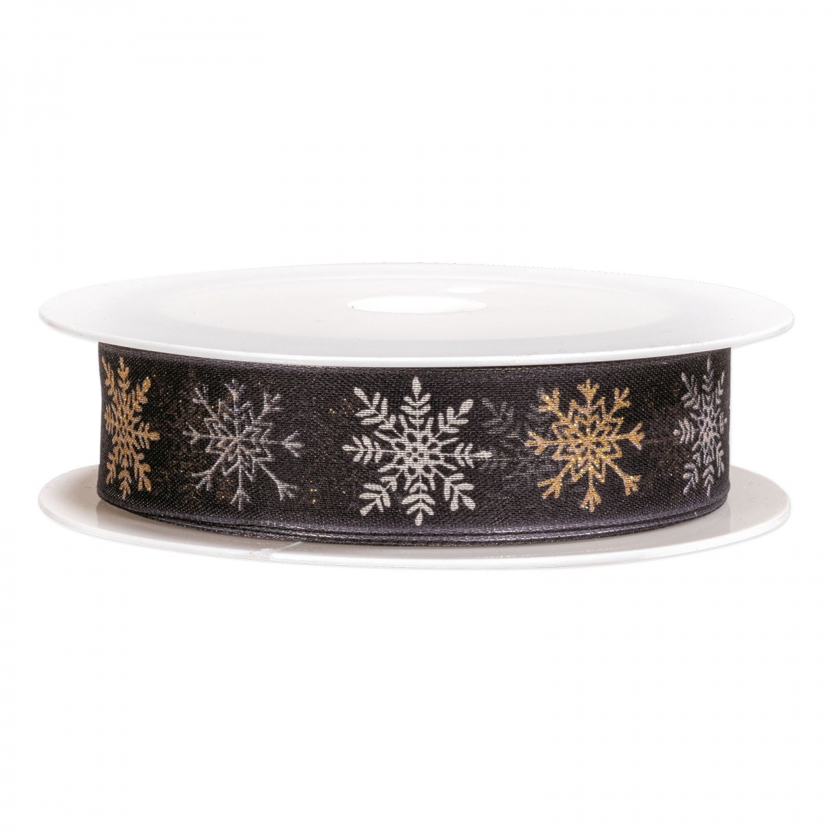 Gewebtes Band in Schwarz mit goldenen und silbernen Schneekristallen bedruckt.