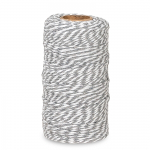 Die gedrehte Baumwollkordel in den Farben Grau und Weiß eignet sich, um Geschenke zu umwickeln oder als Bändchen für Anhänger.