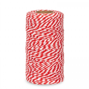 Die gedrehte Baumwollkordel in den Farben Rot und Weiß eignet sich, um Geschenke zu umwickeln oder als Bändchen für Anhänger.