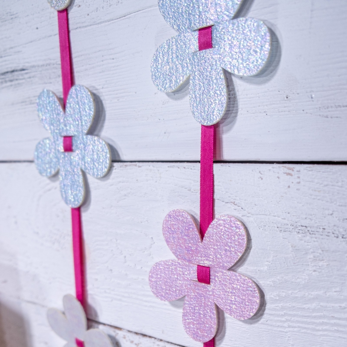 Diese glänzenden Blüten lassen sich durch einen Schlitz einfach an Bänder anbringen.