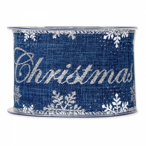 Breites, gewebtes Geschenkband in Blau mit Schriftzug "Merry Christmas" und Schneeflocken in Silberglitter bedruckt.