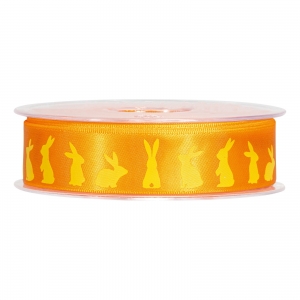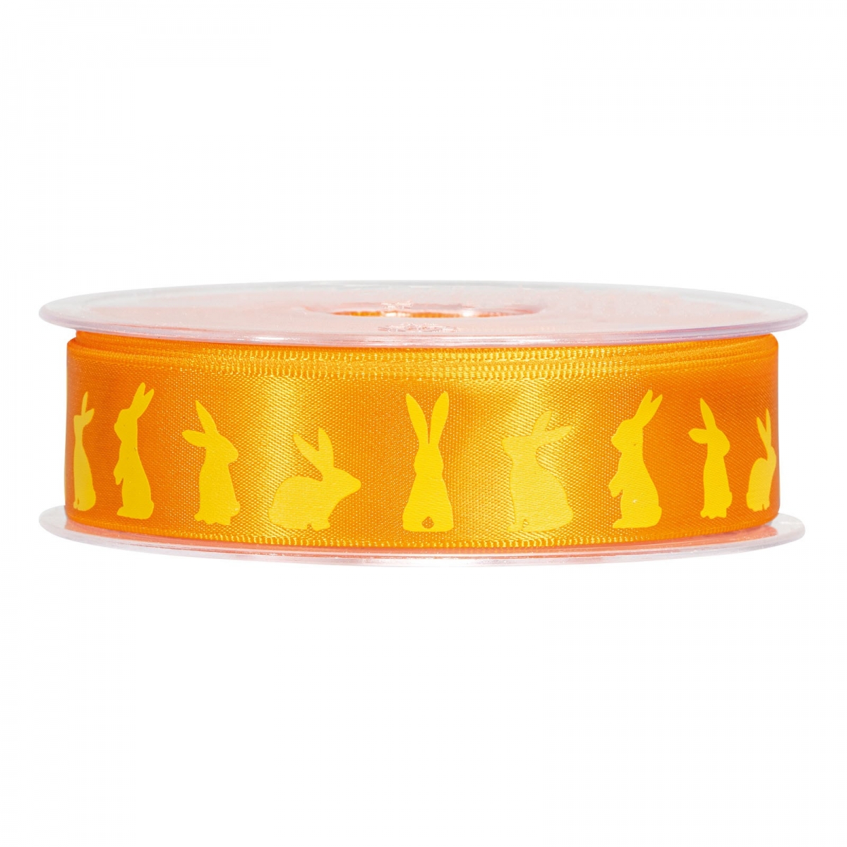 Das orangefarbene Satinband ist mit gelben Hasen bedruckt.