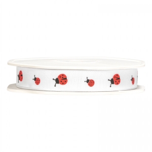 Gewebtes Geschenkband in Weiß mit roten Marienkäfern bedruckt.