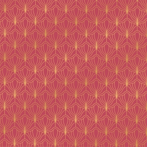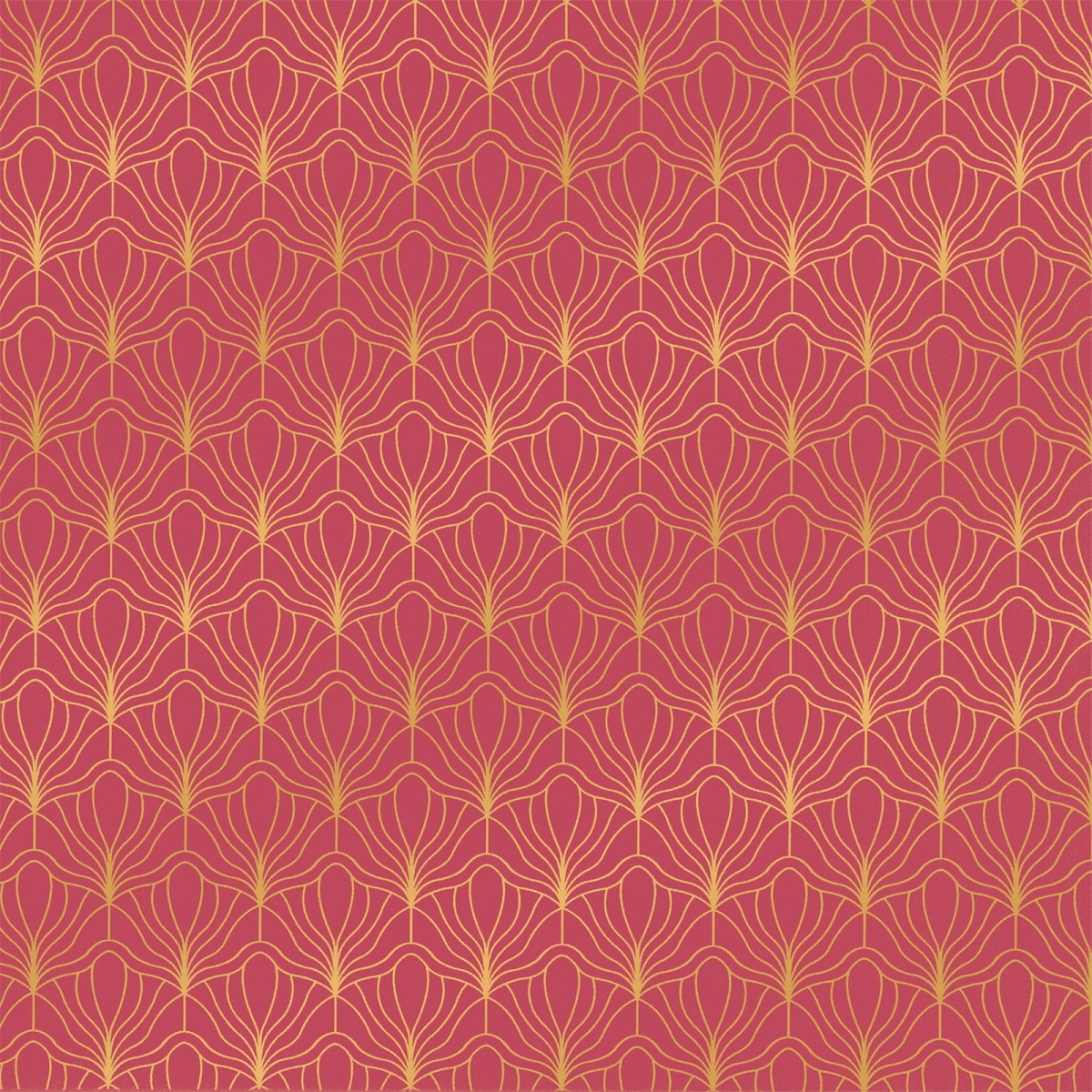 Korallefarbenes Geschenkpapier mit goldenem Ornamet-Druck auf Secare-Rolle.