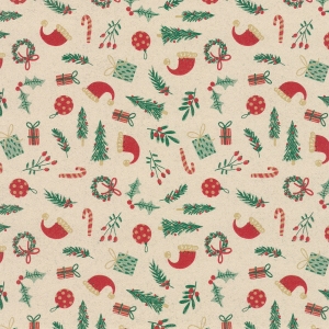 Weihnachtliches Geschenkpapier, bedruckt mit Nikolausmützen, Ilexzweigen, Zuckerstangen und vielem mehr.
