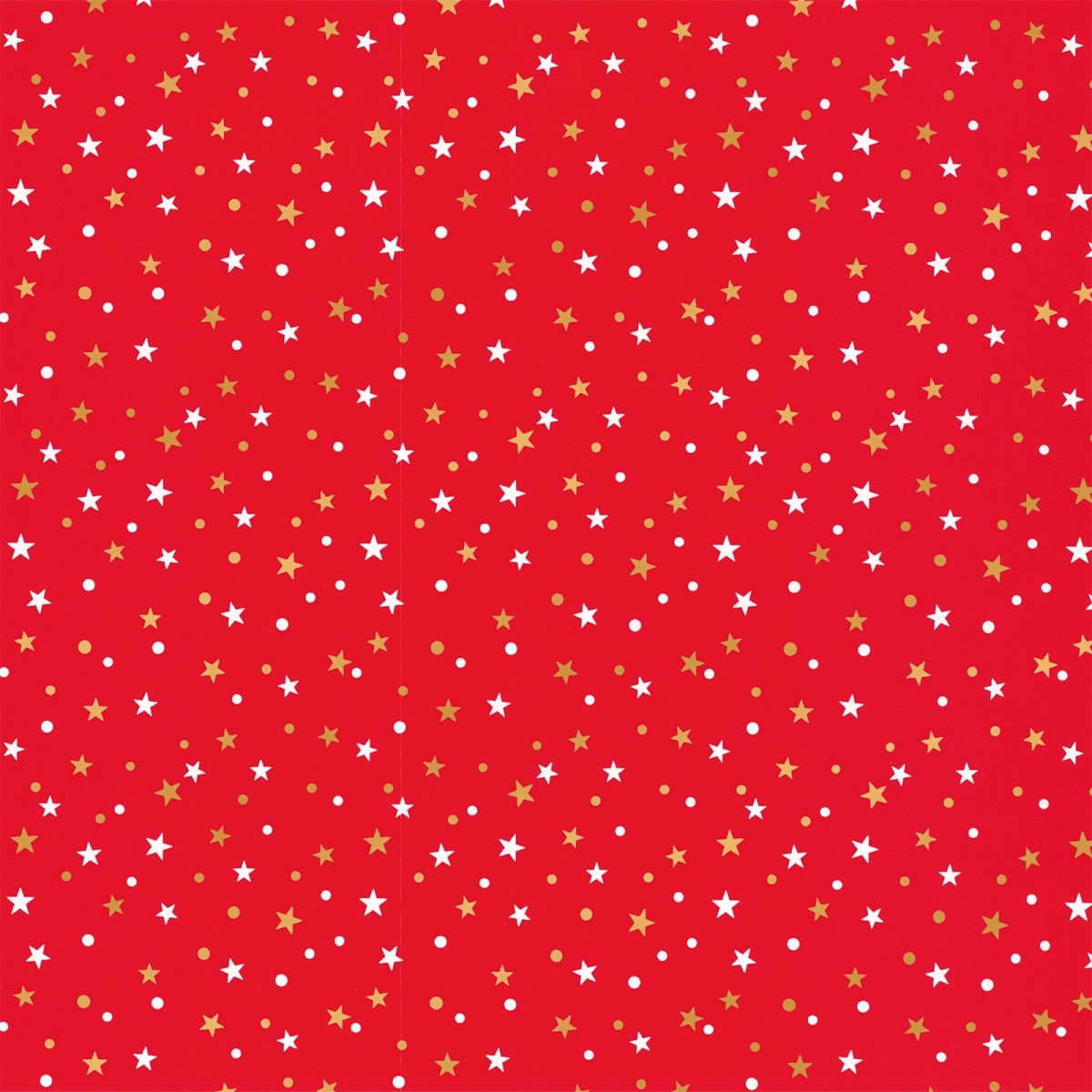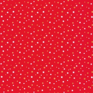 Schönes, rotes Geschenkpapier mit weißen und goldenen Sternchen und Punkten.