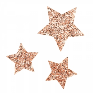 Glitzerstern mit Klebepunkt, in zwei Größen sortiert, Farbe Kupfer. Die Sterne eignen sich sehr gut um Präsentkartons, Geschenktaschen oder Briefumschläge zu schmücken. Material: Polyester.