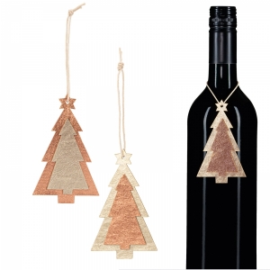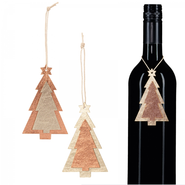 Zwei verschiedene Tannenbäume aus Holz mit einer glänzenden Oberfläche. Die Anhänger eignen sich sehr schön als Flaschenschmuck oder Geschenkanhänger.