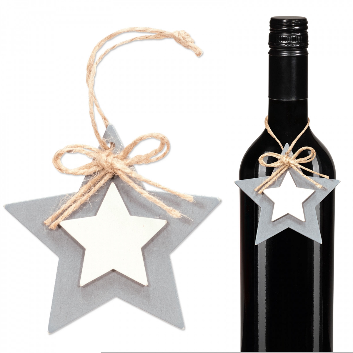 Der Sternanhänger im Landhausstil ist blaugrau mit einem aufgesetzten weißen, kleineren Stern.