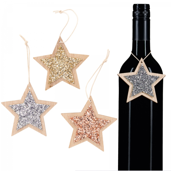Hübscher Stern aus Holz mit Glitzer, sortiert in den Farben Natur mit Gold, Silber und Kupfer. Ideal als Flaschen- oder Weihnachtsbaumschmuck.