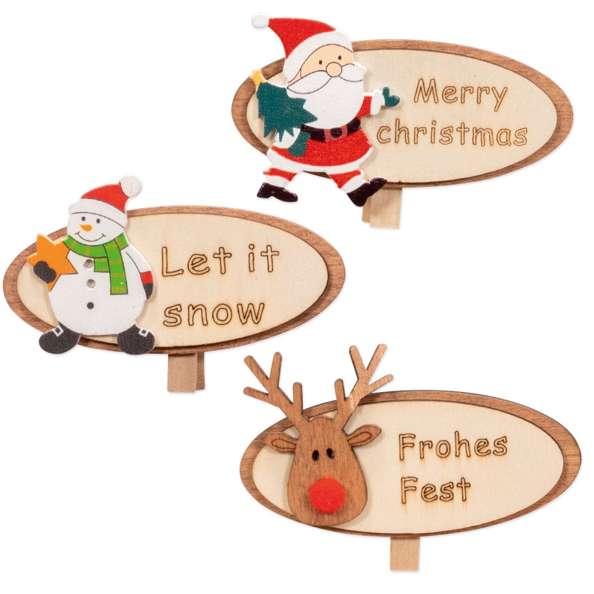 Die kleinen Baumscheiben sind mit Weihnachtsgrüßen beschriftet und mit einem Schneemann, einem Rentier oder einem Weihnachtsmann verziert. Durch die Holzklammer auf der Rückseite kann man den Artikel an vielen Produkten gut befestigen.