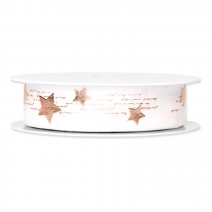 Weihnachtliches Geschenkband in Weiß mit roségoldenen Sternen bedruckt.