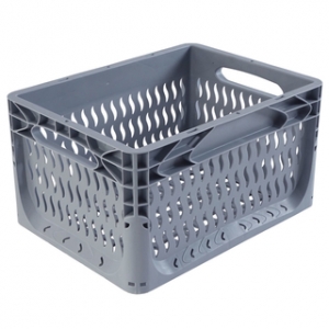 Grauer Euronorm Behälter durchbrochen mit dem Außenmaß 400 x 300 x 220 mm (Länge x Breite x Höhe), offene Handgriffe.
