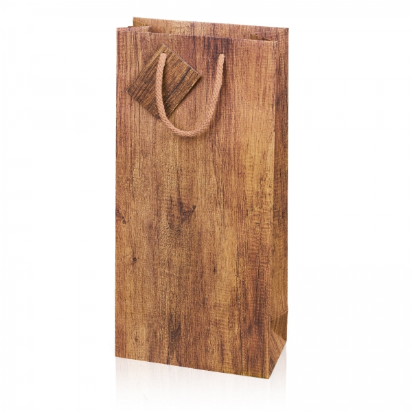 Tragetasche aus Papier mit matter Oberfläche in Holzoptik. Passend für zwei Flaschen Wein/Sekt.