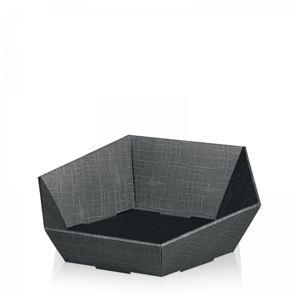 Dieser sechseckige Präsentkorb hat eine Oberfläche mit Strukturprägung. Der Boden ist in der gleichen Farbe wie die Außenseiten.