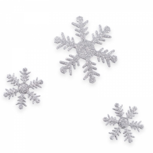 Die Schneeflocken haben eine glitzernde Oberfläche und sind mit einem Klebepunkt versehen.