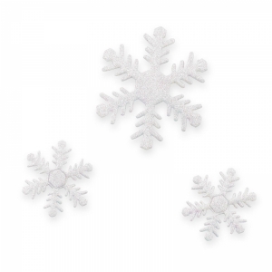 Die Schneeflocken haben eine glitzernde Oberfläche und sind mit einem Klebepunkt versehen.