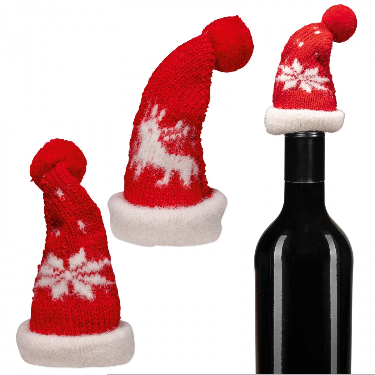 Die Strickmützen mit Rentier und Eiskristallmuster sind groß genug um Sie auf eine Flasche zu setzen und eignen sich auch gut zum Anhängen an eine Schleife.