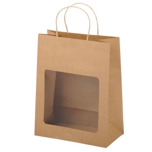 + Tragetasche aus Kraftpapier mit gedrehten Papierkordeln und Sichtfenster