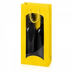 Tragetasche aus Papier mit einer matten Oberfläche und feiner Streifenprägung und Transparentfenster. Passend für zwei Flaschen Wein/Sekt.