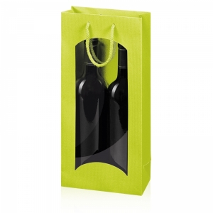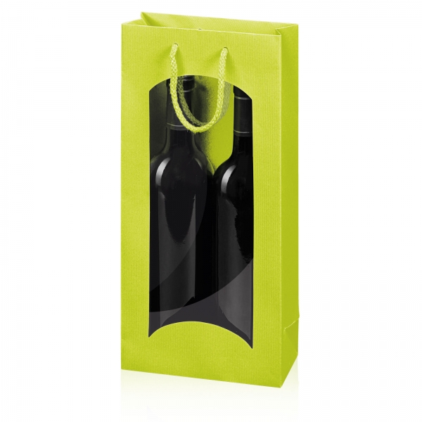 Tragetasche aus Papier mit einer matten Oberfläche und feiner Streifenprägung und Transparentfenster. Passend für zwei Flaschen Wein/Sekt.