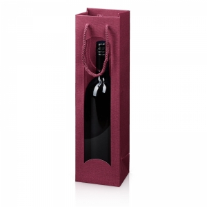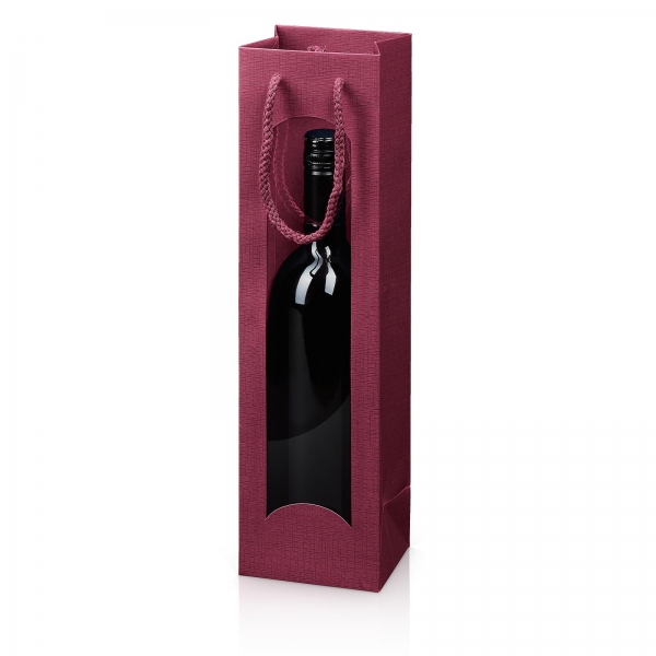 Tragetasche aus Papier mit einer matten Oberfläche und einer Prägung in Leinenstruktur sowie Transparentfenster. Passend für Wein/Sekt.