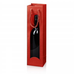 Tragetasche aus Papier mit einer matten Oberfläche und einer Prägung in Leinenstruktur sowie Transparentfenster. Passend für Wein/Sekt.