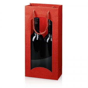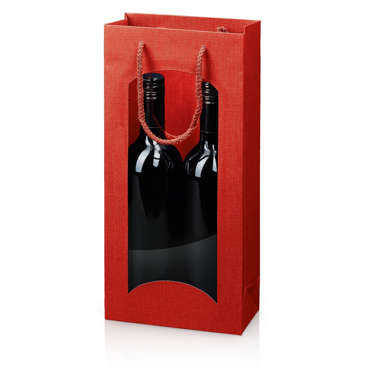 Tragetasche aus Papier mit einer matten Oberfläche und einer Prägung in Leinenstruktur sowie Transparentfenster. Passend für zwei Flaschen Wein/Sekt.