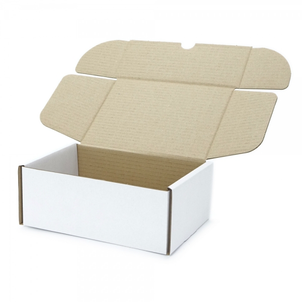 Ein stabile Faltschachtel aus weißer Wellpappe.